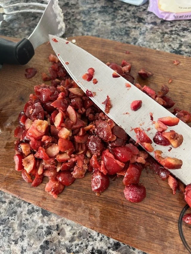 Finally, chop 2 cups of frozen cherries to your desired size, and separately, chop ½ cup of roasted almonds. Set aside 1 tablespoon of the almonds for the topping.